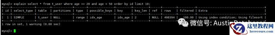 mysql> select * from t_user where age >= 20 and age < 50 order by id limit 10;