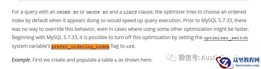 这个参数如果大家细心的情况下,在我们的MYSQL 5.7 也有这个参数,而且这个参数是关闭的见上图。先说说这个参数的历史,这个参数是在 MYSQL5.7.33 版本上产生的,目的就是为了要提高整体的SQL 在运行ORDER BY LIMIT GROUP BY 时,可以选择有序索引提高数据排序的的速度和 提高语句执行的效率。但是基于一贯的风格,这个参数虽然在MYSQL 5.7.33 中推出但默认是关闭的所以当时的使用这个版本的应用并未受到影响,而这个参数发布的版本也是MYSQL5.7 最靠后的版本,所以这边版本本身就使用的人少。