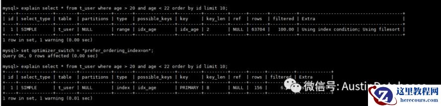 mysql> set optimizer_switch = "prefer_ordering_index=on";Query OK, 0 rows affected (0.00 sec)mysql> explain select * from t_user where age > 20 and age < 22 order by id limit 10,20;+----+-------------+--------+------------+-------+---------------+---------+---------+------+------+----------+-------------+| id | select_type | table | partitions | type | possible_keys | key | key_len | ref | rows | filtered | Extra |+----+-------------+--------+------------+-------+---------------+---------+---------+------+------+----------+-------------+| 1 | SIMPLE | t_user | NULL | index | idx_age | PRIMARY | 8 | NULL | 604 | 4.96 | Using where |+----+-------------+--------+------------+-------+---------------+---------+---------+------+------+----------+-------------+1 row in set, 1 warning (0.00 sec)mysql> explain select * from t_user where age > 20 and age < 22 order by id limit 10000,10010;+----+-------------+--------+------------+-------+---------------+---------+---------+------+-------+----------+---------------------------------------+| id | select_type | table | partitions | type | possible_keys | key | key_len | ref | rows | filtered | Extra |+----+-------------+--------+------------+-------+---------------+---------+---------+------+-------+----------+---------------------------------------+| 1 | SIMPLE | t_user | NULL | range | idx_age | idx_age | 2 | NULL | 49484 | 100.00 | Using index condition; Using filesort |+----+-------------+--------+------------+-------+---------------+---------+---------+------+-------+----------+---------------------------------------+1 row in set, 1 warning (0.00 sec)而在MYSQL 曾经提交的BUG 中也有这个部分的身影,所以 prefer_order_index 的参数是一个双刃剑,如果你打开了这个参数,那么如果你发现一些语句突发性的变慢,不要慌张,先看看是不是这个参数打开导致的问题,尤其是 order by limit 的SQL。