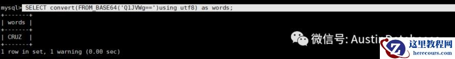SELECT convert(FROM_BASE64('Q1JVWg==')using utf8) as words;