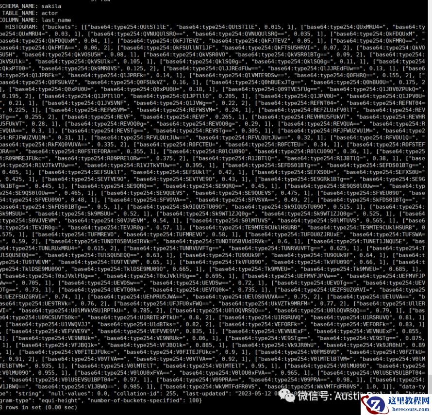 运行对表列分析的产生直方图后,根据表中的标识的schema_name,table_name,column_name, Histogram 来对表的列进行一个标识,其中可以看下图中histogram中的buckedts 并不是你认识的文字,而是base64 type254 ,在MYSQL中这些字符是为了减少存储的,直接MYSQL可以将这些全部转换为,原来的字符,方式为