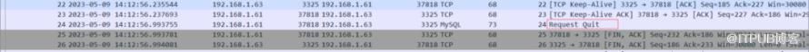 也就是不再进行socket通道的poll和read操作,自然不会在读取包了,也就不会有读取到fin包返回0字节的问题了,当然也就没有错误。在handle_connection函数中调用close 函数关闭session 的socket ,返回客户端fin包,来完成四次挥手。这个时候会发现有COM_QUIT包,抓包如下: