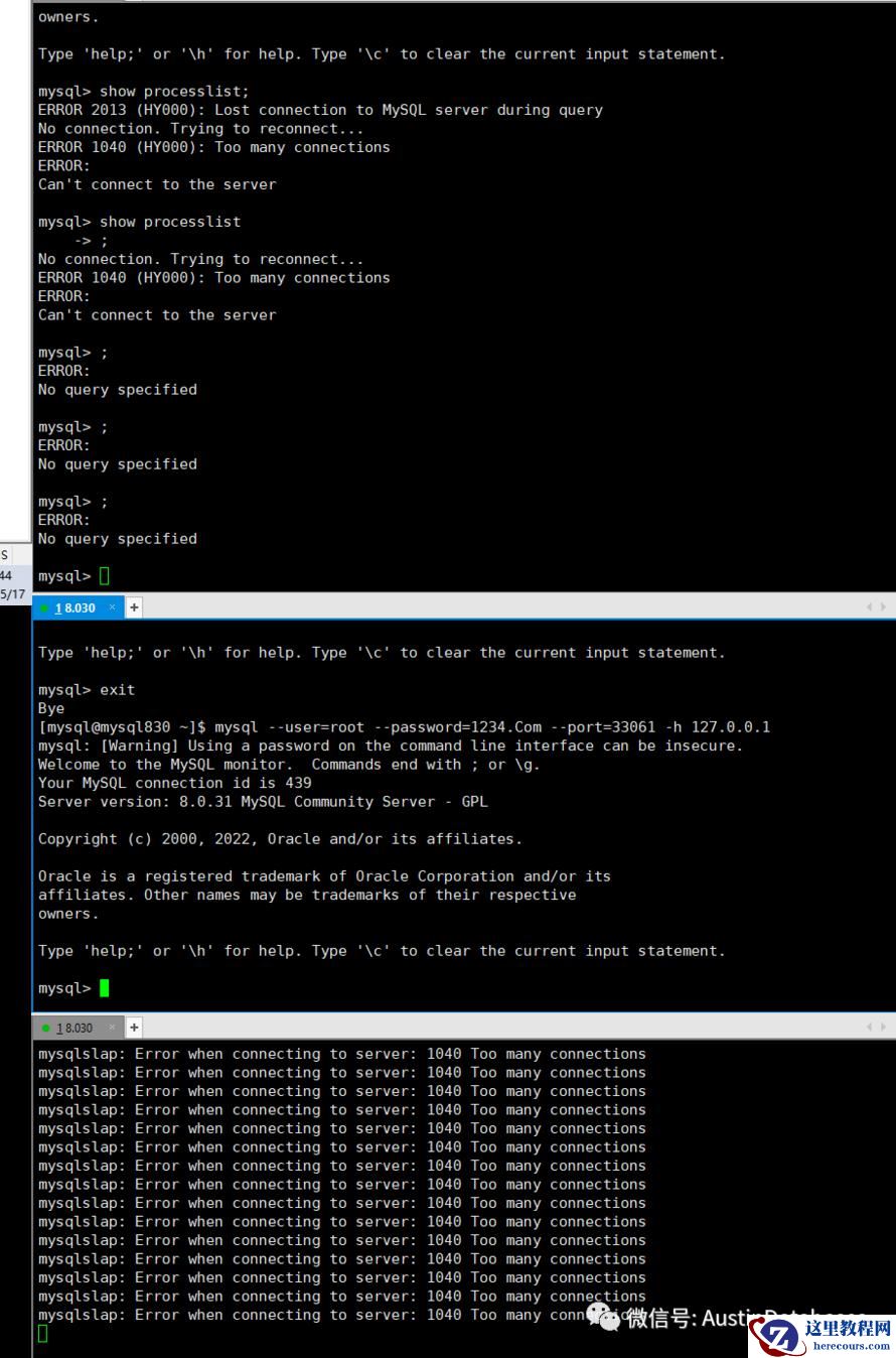 我们做一个实验,当前最大的连接数是 300,我们同时通过管理员账号,发起300个并发连接,同时我们在通过管理员账号来连接数据库,在通过我们刚才设置的新的MYSQL TOO MANY CONNECTIONS 的8.014 的特性进行连接,下图很明显,我们连接成功,而普通的方式则不可以,已经 too many connections 了。