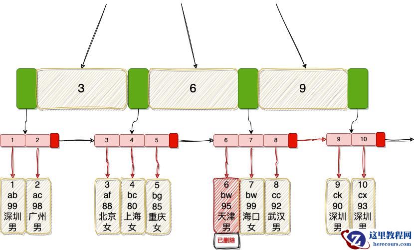 经过前面文章的介绍,小伙伴们应该已经清楚,MySQL 表中的数据最终是以 B+Tree 的形式保存在磁盘中的,当你要删除一条记录的时候,那么对应的叶子上的数据就会被标记为已删除,类似下面这样: