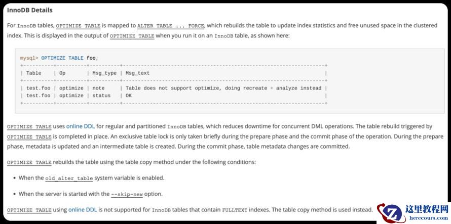 同时,官方文档中这段介绍还提到了 optimize 操作是 online DDL 的。online DDL 意味着在执行 optimize 重整表的时候,并不会阻塞正在进行的 CURD 操作。具体流程如下: