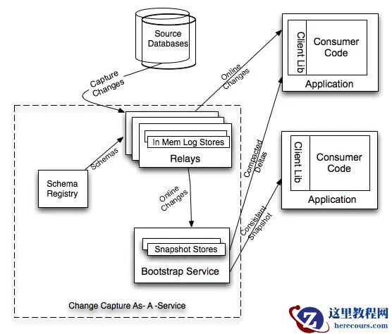 Databus 由 Relays、bootstrap 服务和 Client lib 等组成,Bootstrap 服务中包括 Bootstrap Producer 和 Bootstrap Server。