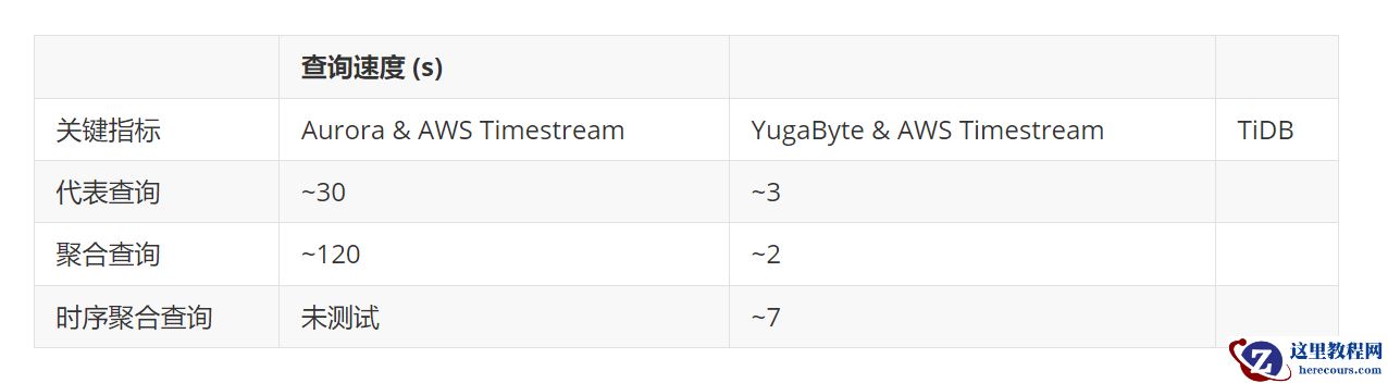 TiDB 对典型查询和聚合查询的响应时间都在几秒钟之内,比其他候选解决方案快得多。同时,TiDB 对时序聚合查询的表现也足够灵活敏捷,7 秒内返回结果。下表总结了一些关键的测试结果。