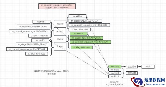 C. 通过提交队列头部获取的下一个worker线程,其节点的m_commit_sequence_nr信息必须和当前提交事务的worker id的m_commit_sequence_nr+1 相同