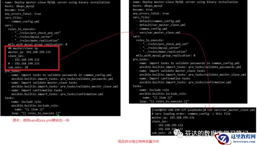 我决定从结构和使用习惯两个方面对其进行修复和调整。修复的方法是将可能需要手动修改的特殊变量从 xxx.yml 文件移至 vars/var_xxx.yml 文件中。这种修复方式并不会影响用户的使用体验,用户依然可以根据需求修改两处的变量,只是之前采用直接在 playbook 的 xxx.yml 文件中修改特殊变量的方式,现在改为在 vars/var_xxx.yml 文件中进行修改。改动如下图: