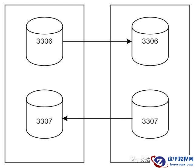 下面,我将使用 dbops 部署这个有坑的架构,并且模拟它如何出现复制回环,架构图如下(箭头方向代表数据流向:)