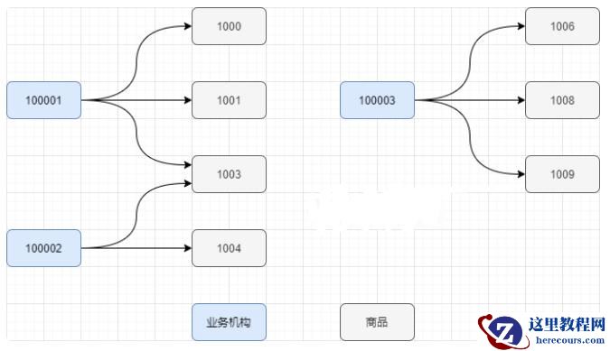 业务机下销售商品,同个业务机构可以销售不同的商品,同个商品可以在不同的业务机构销售,也就说:业务机构与商品是多对多的关系