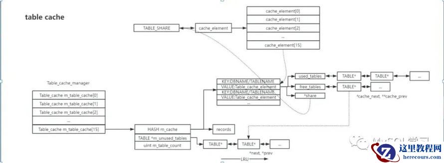 当分析他们的数据结构的时候,可以发现无一例外的是table cache/table def cache/dict table cache均为一个HASH结构和一个LRU结构,HASH结构通常用于定位某一个表的字典信息,而LRU结构通常用于判断先淘汰哪个字典信息,并且HASH结构的key 都是DBNAME.TABLENAME通过hash函数计算得到的,也就是查找的时候通过DBNAME.TABLENAME就可以了。 不同的是table cache更为复杂,它一共分了table_open_cache_instances个实例,我们这里以16为例,每个instance(约定为instance)能够缓存的table instance的数量为table_open_cache/table_open_cache_instances,并且其并不是直接在hash结构存储的table instance的指针而是存储的Table_cache_element元素的指针,也就是每个instance中按照表名为单位进行缓存的这个元素叫做Table_cache_element简称el,而打开的table instance则挂载在其el下面,并且每个el也分为了used_tables链表和free_tables链表,并且含一个table shared的指针。除此之外在table shared下也包含一个el指针的数组,并且大小为table_open_cache_instances的个数,这是因为在分配table instance的时候是按照session来分配的,也就是一个session最多用到一个instance,因此最多的情况下一个表的字典信息可能在每个instance都会存在,因此需要一个el对象。 并且每个基础对象,及TABLE/TABLE_SHARE/dict_table_t 都要包含一些完成链表的结构,将他们串联起来,但是需要注意的是TABLE中有2个链表信息分别为: