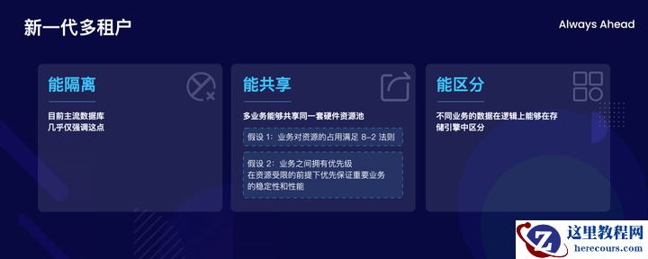 我这边挑一个简单的例子,就从最近发布的多租户能力说起。如果把租户的规模从私有化部署的几十几百个,扩大到十万个、一百万个、一千万个甚至一亿个,平台如何去支撑这么大的租户数量,它需要哪些基础的能力,我们是怎么思考的?第一老生常谈,多租户一定要 隔离 ;第二是 刚才唐刘稍微讲了一下 我们现在在研发的东西:资源管控,我们必须得实现一套很好的机制能够让海量用户更高效地利用和 共享 底层系统的资源,才能达到很低的成本;第三就是 能区分 ,每一个用户在使用的体验上都必须能够感受到自己是在拥有整个数据库的。