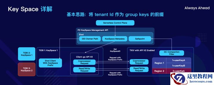 TiKV 是 TiDB 的存储引擎,所有的数据都是通过 key-value 来编码的,Key Space 本质上,就是在编码前面加上一个用户 ID 的前缀,将 tenant ID 作为 group keys 的前缀。