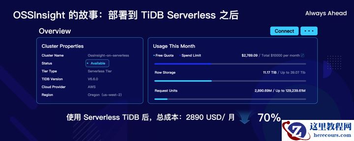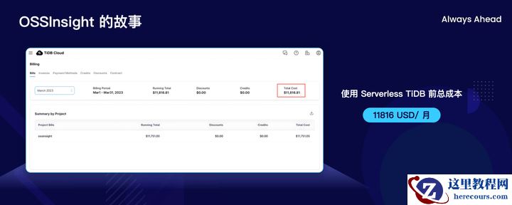 我最后分享一个小小的例子。我们公司内部也有自己用自己产品的习惯,这是我们自己的一些服务 demo,全部用 TiDB 自己构建。我们做了一个很有趣的工具叫 OSS Insight,把 GitHub 上的数据抓下来做分析的一个在线应用,这个在以前传统的 TiDB Cloud,也就是经典 TiDB 云上部署架构下,一个月的成本在一万美金左右,上图就是我们付给自己的账单。