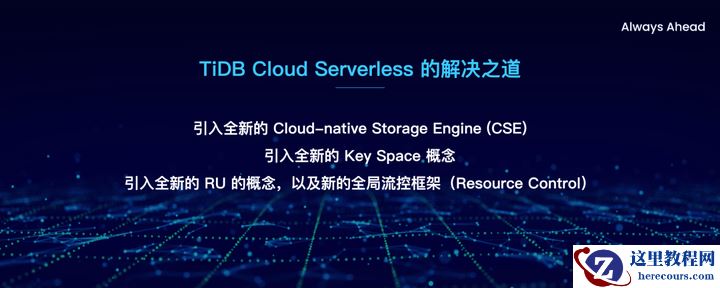 掀开 TiDB Serverless 的引擎盖,大概有三个新的东西,第一个换了新的云原生的引擎 CSE(Cloud-native Storage Engine),非常朴素的名字。第二是终于在 TiDB 引入了逻辑上的 Key Space,第三就是 Resource Control 以及 RU 的概念,从上到下做全局流控。