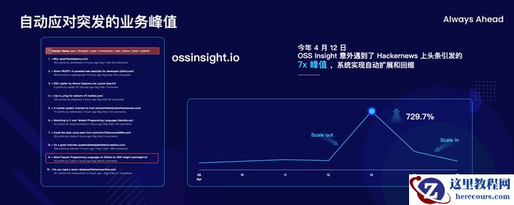 这里有一个很有趣的真实例子,刚才我们看到整体的 TiDB Serverless 的设计是面向弹性去做设计的,但是这种东西总是希望能有一个实际的例子去验证一下这东西是不是真的在现实生活中比较好用,我们也真的有了这样的机会。今年 4 月初 OSS Insight 成功登上了 HackerNews 的首页,流量一下暴增到原来的 7 倍,这个事情还发生在中国时间的深夜,我们的工程师都还在睡梦中,TiDB Serverless 自动发现了流量的突变把集群扩容,承担起 7 倍流量的业务负载以后,又自动缩回来,前端业务的各项指标都还是非常稳定的,也没有额外的收费。这是一个特别好的例子,我们也特别欣慰。