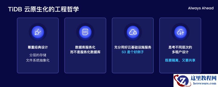 八年前一开始设计 TiDB 的时候,我看到的东西就是一台台具体的服务器,我看到的是 CPU、内存、磁盘,基于这些东西我们构造了 TiDB。但是如果我们现在在云上构建 Serverless 这个系统,拿到的是一张白纸,我今天重新再开始去设计这个系统的时候,我看到的已经不是 CPU、磁盘机器这样的东西了,我看到的东西是云上给我的服务,EC2、虚拟机,我看到的是对象存储,我甚至可以看到云厂商的 RDS,我能不能拿 RDS 作为系统的一部分,所以在新的云原生的工程哲学里边必须有一条能够充分利用云的基础设施,这也是我们能把成本推到如此极限的一个核心的思想。