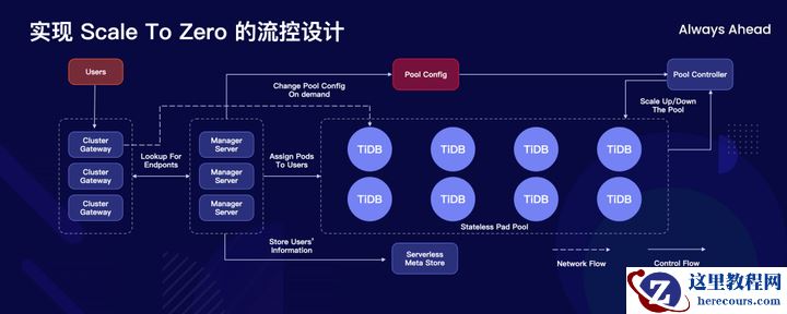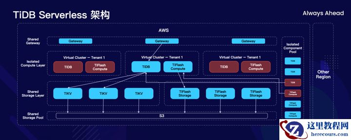 图中 TiDB 右边现在已经把所有的包括计算节点存储节点全都变成了池化的设计,最上面加入了一层 Gateway,用户直接连接到 Gateway,Gateway 负责对现在用户的请求从资源池中捞出一个活跃的节点,它不用的时候连接断开再放回去。