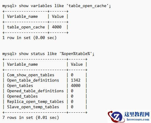 这个需要执行下面的命令来检查。可以看到参数 table_open_cache 定义了缓存4000个,实际达到的 Open_tables是4000.这两个一个是variable,另外一个是状态status