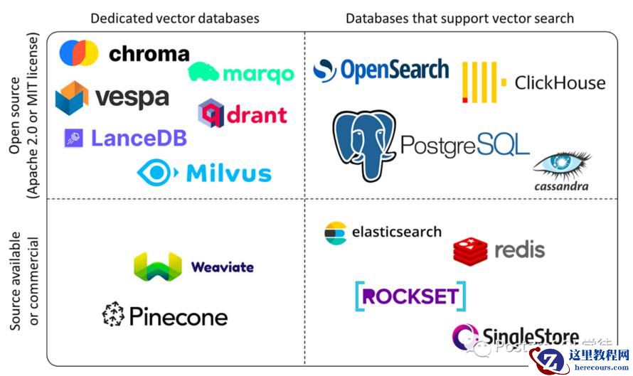 “市面上有许多向量数据库产品,商业的有 Pinecone,Zilliz,开源的有 Milvus,Qdrant 等,基于已有流行数据库以插件形式提供的则有 pgvector 与 Redis Stack。