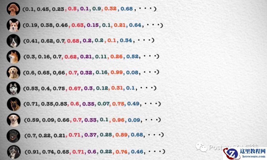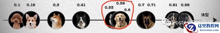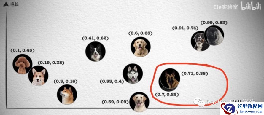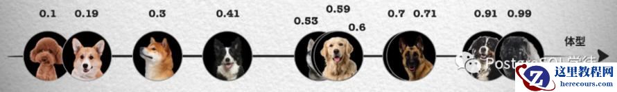 上面这张照片如果按照体型排序,可以看到体型越大的狗越靠近坐标轴右边,这样就能得到一个体型特征的一维坐标和对应的数值,从 0 到 1 的数字中得到每只狗在坐标系中的位置。