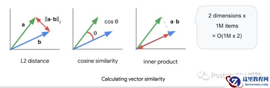 可以看到 pgvector 支持余弦、欧式和内积操作符。内积 (inner product) 一般用在内积空间中,点积 (dot product) 一般用在欧几里得空间中,数量积 (scalar product) 通常认为与点积是相等的。