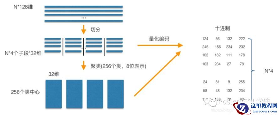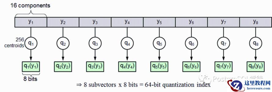 乘积量化——Product Quantization (PQ),意思是指把原来的向量空间分解为若干个低维向量空间的笛卡尔积,并对分解得到的低维向量空间分别做量化(quantization)。这样每个向量就能由多个低维空间的量化code组合表示。PQ 先将 D 维空间切分成 M 份,现在考虑一个 D=128 维的原始向量,它被切分成了 M=8 个 D=16 维的短向量。