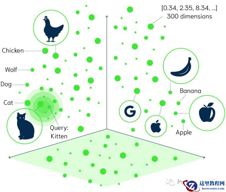 通过向量,那些概念上更为接近的点在空间中更为聚集 (不妨通俗地理解成我们常说的——物理类聚,人以群分),而那些概念相差甚远的点,在坐标系里的距离也就相距很远。比如鸡 (chicken) 和猫 (cat) 都属于动物,所以在坐标系里的距离相近,而与香蕉 (banana) 相距甚远。