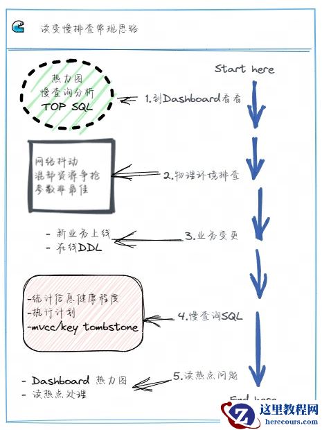 接着,和写入变慢的分析一样,我们可以依次排查物理硬件环境、是否有业务变更操作等情况,直到定位清楚问题。如下图所示,业务读 SQL 变慢的分析思路可以有下面步骤: