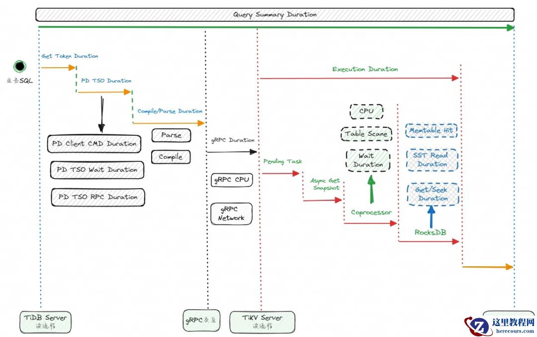 上面描述的过程,大致就是一个查询请求在 TiDB 集群内部的流转步骤,这也是我们在遇到读慢时的分析步骤。