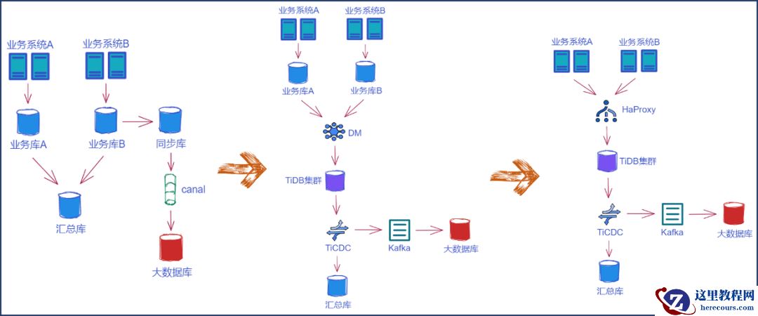 下面具体讲下业务的上线步骤。业务 A 和 业务 B 做了一些分表分库,分完库之后还需要做数据聚合,再同步到 MySQL 汇总库。除了汇总库之外,我们还有大数据平台,通过 Canal 去 MySQL 里面抽一些同步的数据,处理之后扔到大数据库。当要切到 TiDB 上的时候,我们先把 MySQL 的数据通过 DM 同步到 TiDB,TiDB 再通过 TiCDC 将数据写入到下游的汇总库,另一端输出到 Kafka 同步到大数据库。这个架构跑了一段时间,验证了数据同步是没问题后,就会把业务应用真正切到 TiDB 集群上。切换到时候只需要把 JDBC 链接内的地址配成 HAProxy 的地址,就完成一个业务系统的上线。