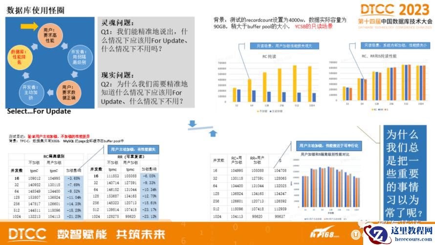 可是如图4左上部所示,存在一个死循环:用户希望数据库性能高(成本低),于是开发者会把应用的隔离级别设置为RC,可是用户尤其是金融保险证券电信等用户又期望保证数据的正确性,于是开发者不得不在SQL语句中加入“Select…For Update”以确保数据的正确性,但是,此举会导致数据库系统性能下降严重,如图4在TPC-C和YCSB场景下测试结果表明,用户主动加锁的方式会导致数据库系统性能下降严重。