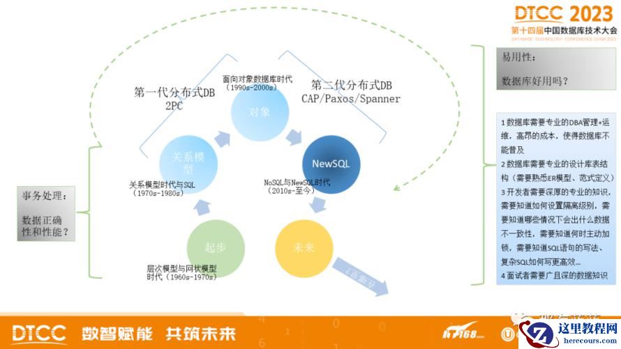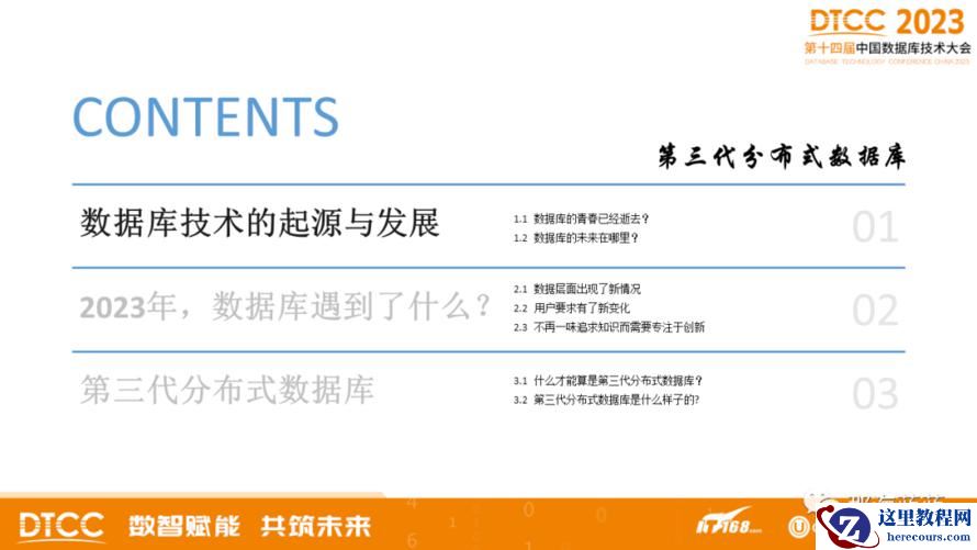 2023年8月DTCC,分享了题为“第三代分布式数据库”的内容。其中,包括了三个方面的内容,如图1: