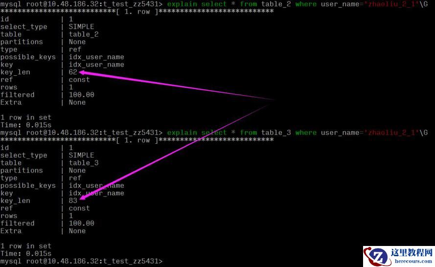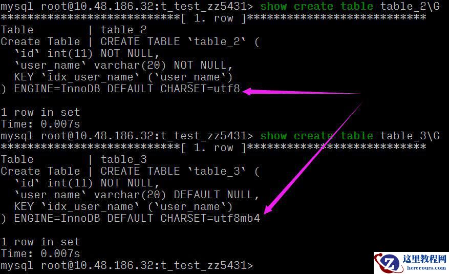 可以看到同样的 varchar(20) 长度,table_2 要比 table_3 索引长度大,这是因为:
