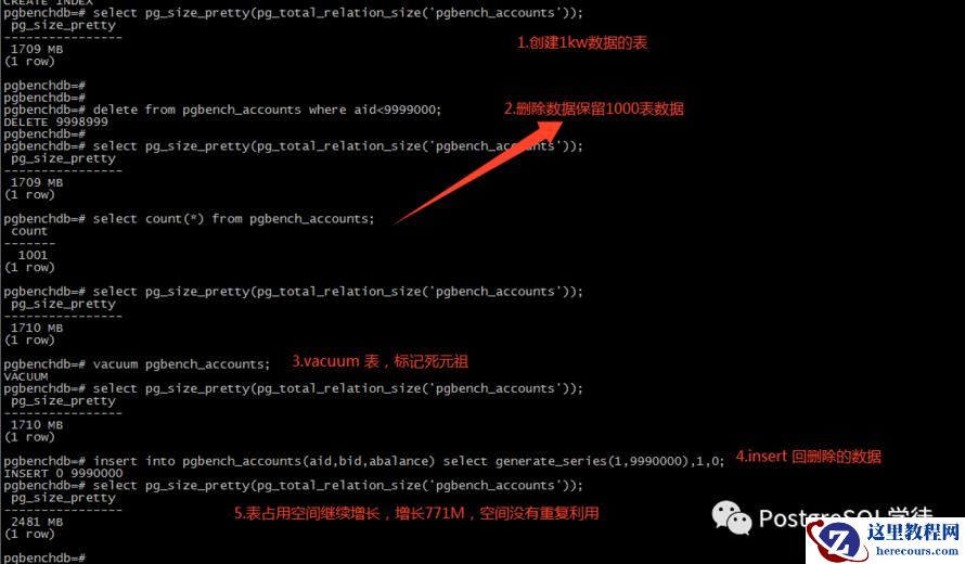 这也让我想起了之前学徒 ① 群有位朋友提到的案例,即删完数据的空间 vacuum 之后不能有效复用,空间一直上涨,版本是 12.8,操作如下????????
