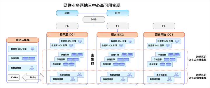 北京银行的 TiDB 集群采用了两地三中心高可用的五副本架构。以网联系统为例,在和平里、顺义两个 IDC 跨机房同城构建分布式数据库集群,每个 IDC 部署两副本,西安 IDC 单副本做异地的数据同步,不承载业务,同时在顺义搭建了集群做本地的灾备。和平里、顺义两个主机房和西安异地备份机房采用 2-2-1 的模式,通过北京的四个副本向前端业务提供实时数据服务,这个架构可以高效地支撑联机交易类业务。目前,最大记录表的交易数已超过 20 亿条,完全满足高性能的金融业务的要求。