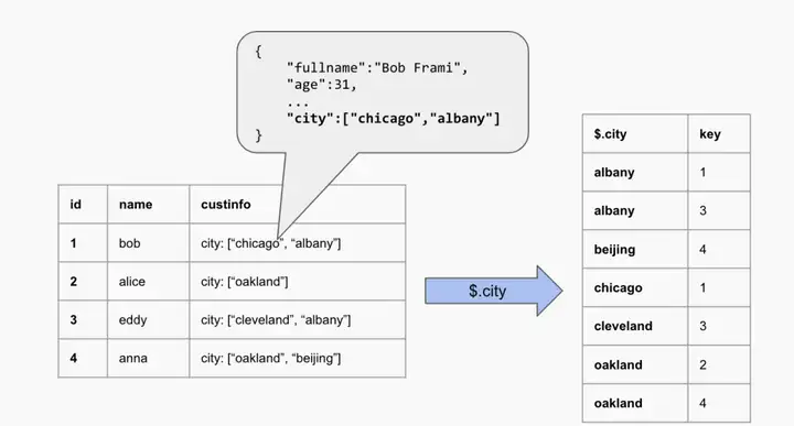 当我们需要检索哪些客户在北京时,如果没有多值索引,这个查询需要扫描整张表。