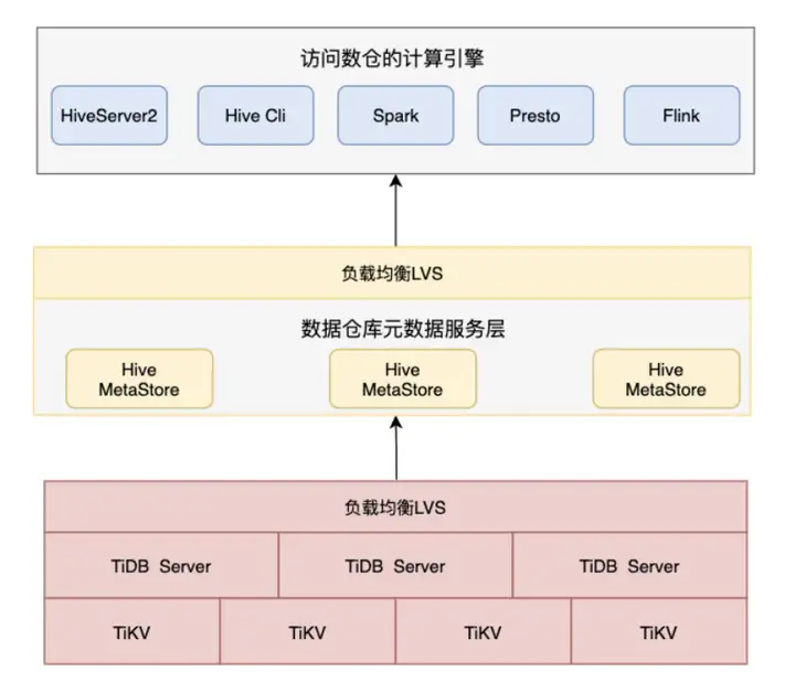 TiDB 是 PingCAP 公司自主设计、研发的开源分布式关系型数据库,是一款同时支持在线事务处理与在线分析处理 (Hybrid Transactional and Analytical Processing, HTAP) 的融合型分布式数据库产品,具备水平扩容或者缩容、金融级高可用、实时 HTAP、云原生的分布式数据库、兼容 MySQL 5.7 协议和 MySQL 生态等重要特性。在 TiDB 4.x 版本中,其性能及稳定性较与之前版本得到了很大的提升并满足 HMS 的元数据查询性能需求。故我们对 TiDB 也做了相应的调研及测试。结合 HMS 及大数据生态,采用 TiDB 作为元数据存储整体的部署架构如下: