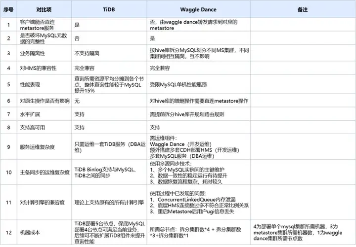 前面内容对 Waggle-dance 方案和 TiDB 方案做了简单的介绍及优势总结,以下列举了这两个方案在多个维度的对比: