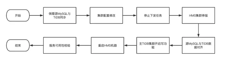 在上述架构中,切换前唯 一可写入的数据源只有源数据库主库,其他所有 TiDB、MySQL 节点都为只读状态,当且仅当所有 HMS 节点停服后,MySQL 源数据库从库及 TiDB 源数据库主库的数据同步最大时间戳与源数据库主库一致时,TiDB 源数据库主库才开放可写入权限,并在修改 HMS 底层存储连接串后逐一拉起 HMS 服务。