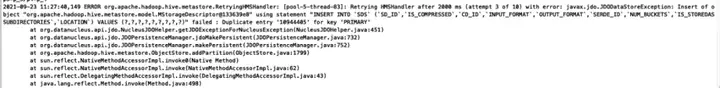 此外在开启 sentry 服务状态下,需确认 sentry 元数据中 NOTIFICATION_ID 的值是否落后于 HMS 元数据库中 NOTIFICATION_SEQUENCE 表中的 NEXT_EVENT_ID 值,若落后需将后者替换为前者的值,否则可能会发生建表或创建分区超时异常。