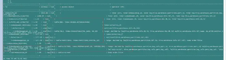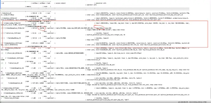 若执行计划不走 idx_PART_KEY_VAL 索引,TiDB 可通过 dbs、tbls 检索出所有关联 partition 数据,在根据 part_id 和过滤条件扫描 PARTITION_KEY_VALS 数据并返回。此类执行计划扫描的数据量和需要查询的表的分区总量有关,如果该表只有少数的分区,则查询能够迅速响应,但如果查询的表有上百万的分区,则该类执行计划对于该类查询不是最优解。