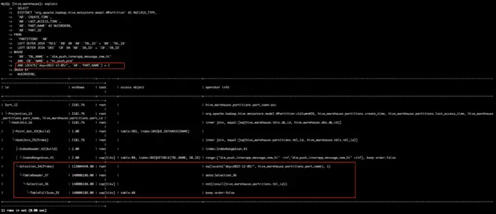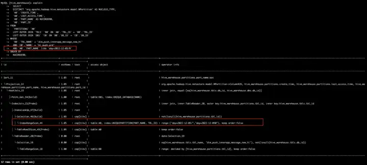 在实际生产中元数据基本都是按天分区为主,每天增长大概有 26w 左右,且范围查询的使用场景较多,使用 idx_PART_KEY_VAL 索引查询的执行计划不太适合线上场景,故该索引需不适合添加到线上环境。