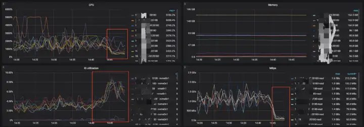 通过实现将 locate 函数查询转换为 like 语法查询,有效降低了 TiKV 端的负载情况。在 HMS 端完成变更后,TiKV 的 CPU 使用率降低了将近一倍,由于在 KV 端进行索引过滤,相应的 io 使用率有所上升,但网络传输则有明显的下降,由平均 1G 降低到 200M 左右。