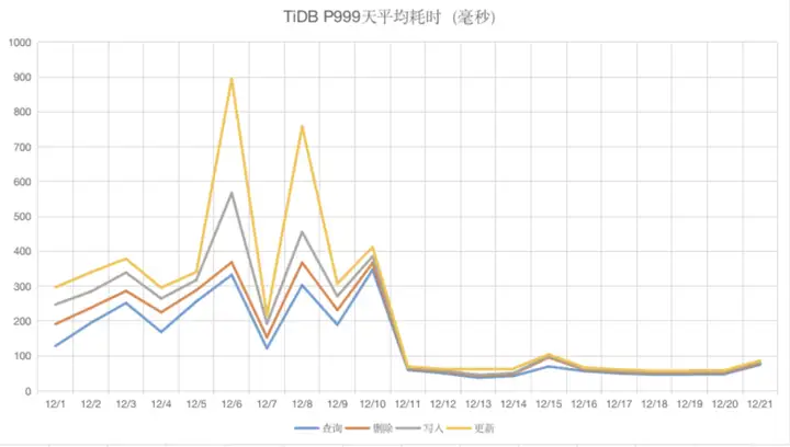 除 TiKV 负载有明显的降低,TiDB 的整体性能也得到明显的提升,各项操作耗时呈量级降低。以下整理了 TiDB 增删改查的天平均耗时情况: