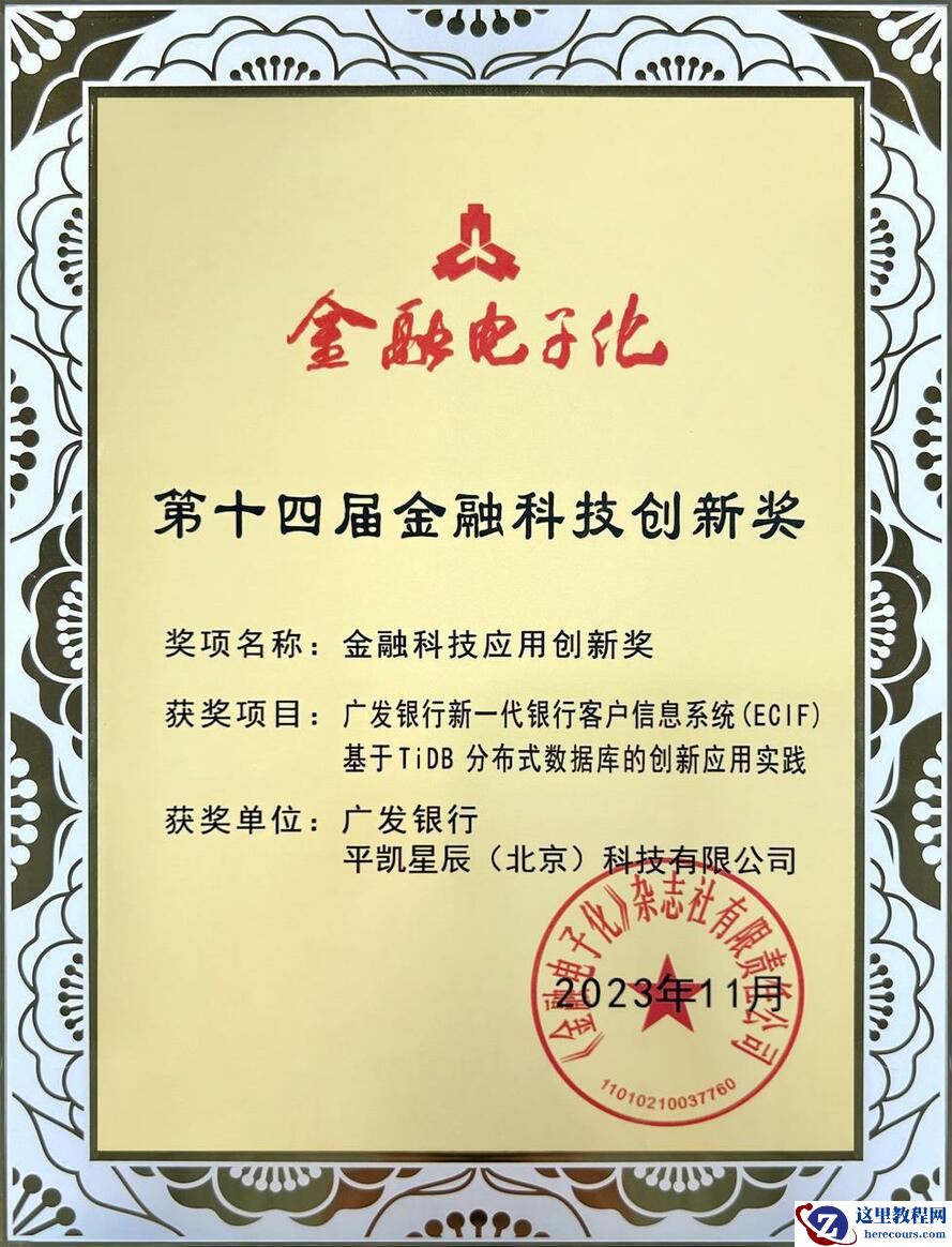 2023 年 11 月 3 日,由《金融电子化》杂志社、苏州市金融科技协会共同主办的“第十四届金融科技创新奖颁奖典礼”在苏州隆重举行。 会上,由平凯星辰(北京)科技有限公司(简称: 平凯星辰)和广发银行共同申报的 “广发银行新一代银行客户信息系统(ECIF)基于 TiDB 分布式数据库的创新应用实践” 荣膺第十四届金融科技创新。