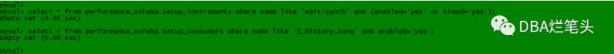 select * from performance_schema.setup_instruments where name like 'wait/sync%' and (enabled='yes' or timed='yes'); select * from performance_schema.setup_consumers where name like '%_history_long' and enabled='yes';