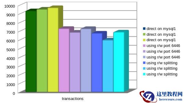 oltp_read_write.lua脚本,然后使用 MySQL 路由器的读/写专用端口 (端口6446) 再次运行它,最后使用读/写拆分端口 (端口6450)。测试使用 8 个线程,每次运行 3 次。