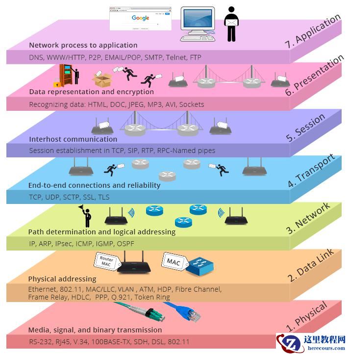 以OSI标准模型为例,分为物理层、数据链路层、网络层、传输层、会话层、表示层和应用层。